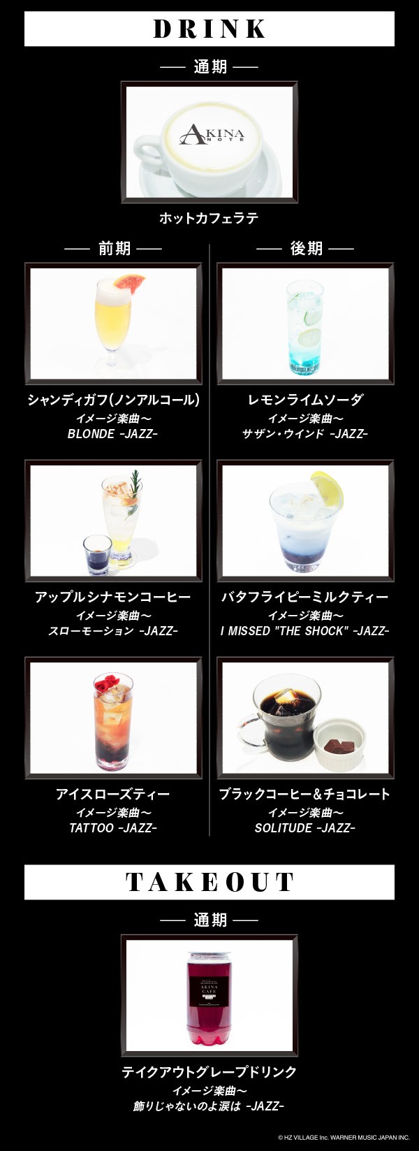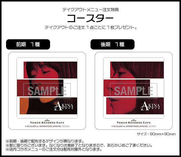 コラボカフェ店内で飲食の上、セルフカバーJAZZアルバム「AKINA NOTE」を含むCD・映像作品を購入した人に先着特典をプレゼント!