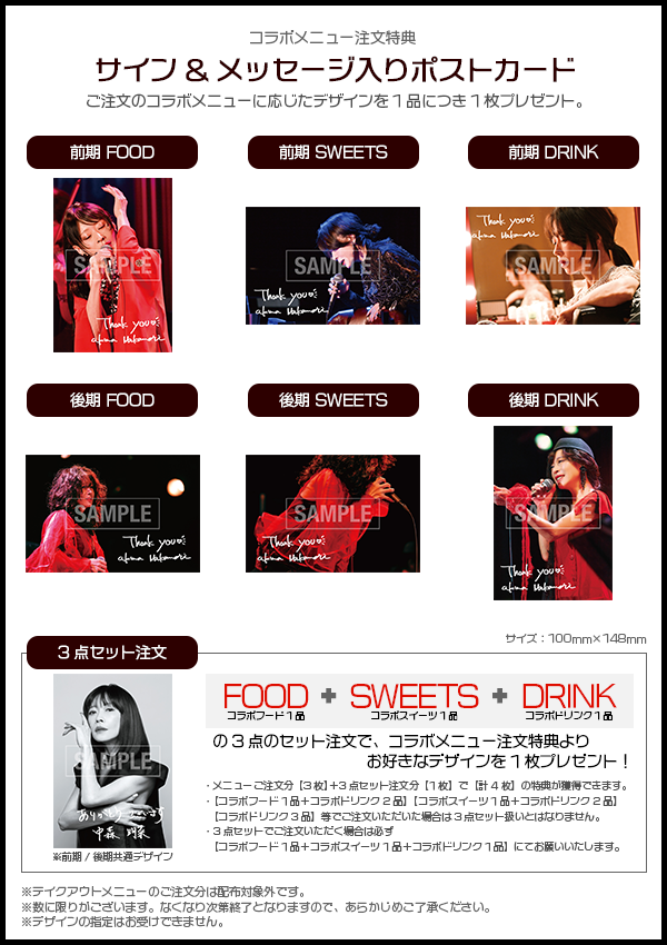 さらに、コラボカフェ店内で飲食の上、「AKINA NOTE」を含むCD・映像作品を購入した人には、先着特典プレゼントも!
